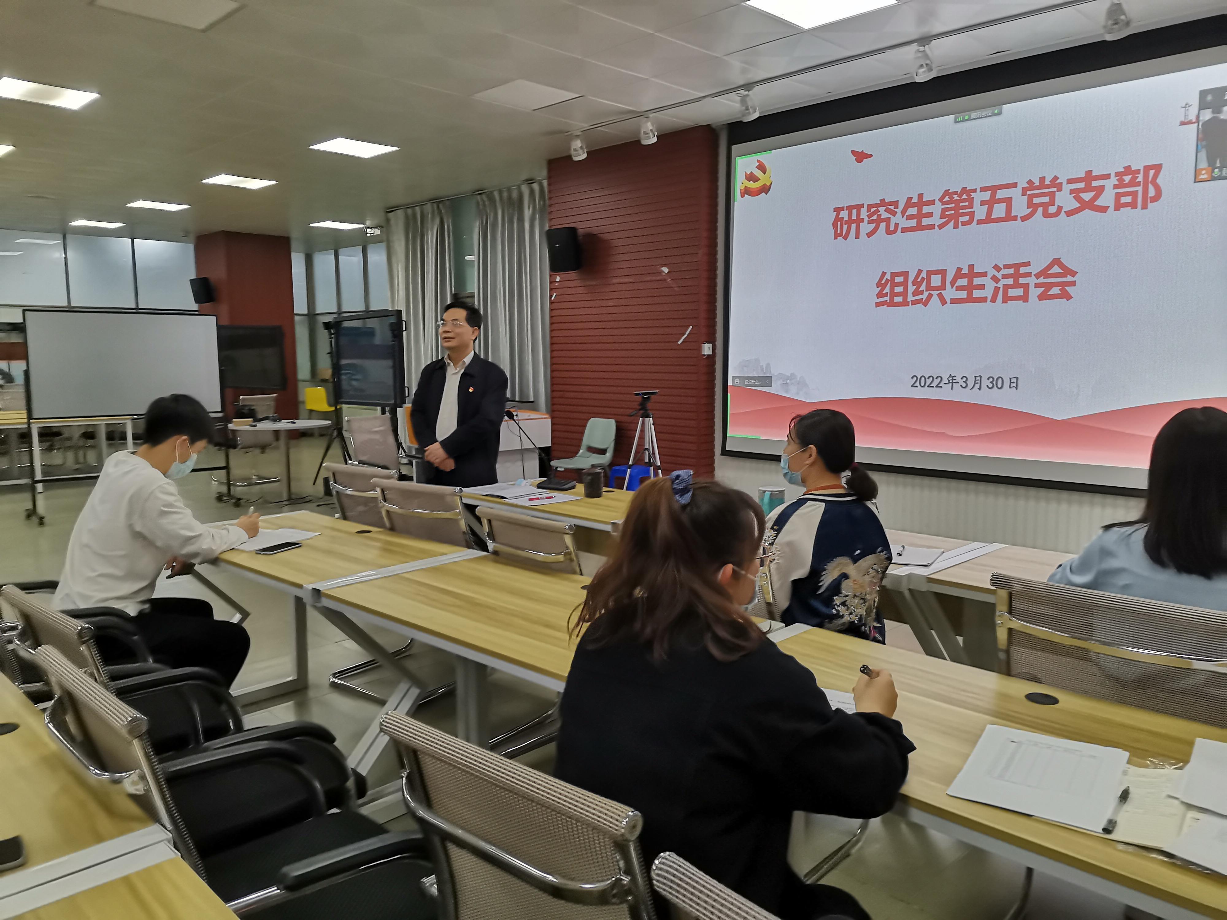 会上,首先由支部书记覃希老师为支部同志讲授本季度党课《遵纪守法 做优秀的大学生》,覃老师强调:大学生党员在学习、工作和生活中要时刻严格恪守党的纪律规定,提高廉洁自律的自觉性,同时带领身边同学们一起成长。接着,覃希老师组织与会同志开展2022年3月主题党日活动。活动以观看“2022年两会会议精神”相关视频、参会同志发表学习心得体会的形式展开。