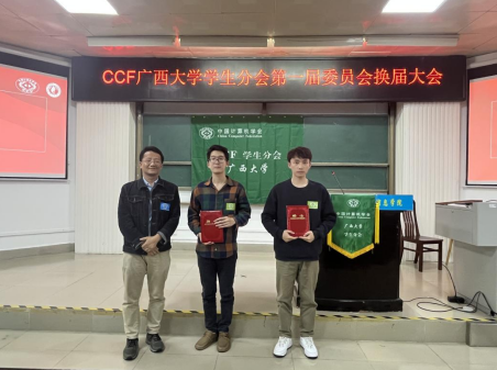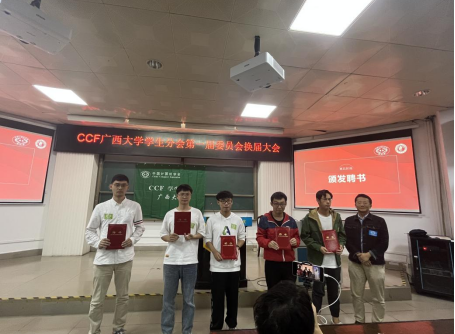 大会通过无记名投票及差额选举的方式,选出新一届中国计算机学会CCF广西大学学生分会主席1名、候任主席1名以及执行委员5名,并由吕品老师为新一届委员颁发聘书。