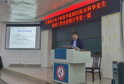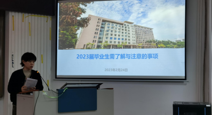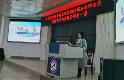 2023年2月24日下午,头号玩家官网登录入口在214报告厅召开2023届本科毕业生就业工作会议暨开学第一课。学院党委副书记邓珍琪老师、学院辅导员杨洋老师和李易明老师、学院教学办公室甘瑜萍老师和罗程老师,以及学院全体2023届本科毕业生参加会议。会议由邓珍琪老师主持,会议主题是“顺利完成学业,尽快落实就业单位”。