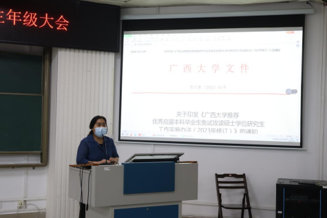 会议第三项议程,学院教学办甘瑜萍老师围绕推免名额、申请条件和综合素质加分项细则、材料报送要求等,向同学们全面细致解读了《广西大学推荐优秀应届本科毕业生免试攻读硕士学位研究生工作实施办法》,着重强调了推免政策较往年的变化,叮嘱同学们要吃透文件精神、熟悉推免流程、把握时间节点,鼓励同学们抓住机会,积极尝试。同时,甘老师还讲解了学分替换的基本原则和流程,她强调,同学们应认真对照培养方案核对自己的学分,确保来年能顺利毕业。