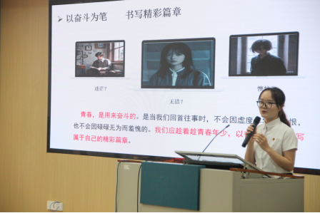 第二项议程,政治理论学习。广西大学“00后”君武青年讲师团成员莫愿芝同学作题为“以青春之名,扬奋斗之志”的主题宣讲,她号召同学们以先辈为榜样,将个人发展紧密融入国家需求之中,努力奋斗,实现自我价值。