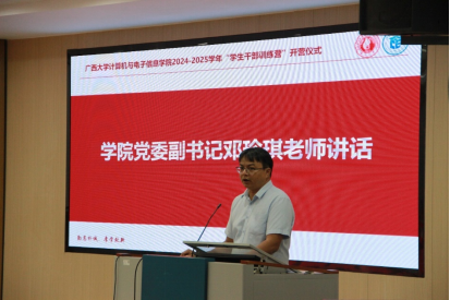 第七项议程,学院党委副书记邓珍琪老师讲话。他强调,全体学员要端正学习态度,积极参与各项培训,严格遵守培训纪律;要时刻牢记学生干部职责,增强服务意识,不辜负老师的嘱托和同学们的信任;要以身作则,在工作中直面挑战,发挥自己的创造性,辐射带动更多同学。最后他宣布本次学生干部训练营正式开营!