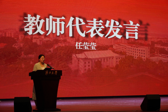 学院党委书记赵进创教授、常务副院长张振荣教授等院领导,特邀98级校友、广西壮族自治区市场监管局科技信息处副处长刘玉华、共青团广西区委青年发展部副部长陈悦柏,研究生导师、各系主任、班主任及全体辅导员出席典礼。开学典礼由学院党委副书记夏士岚老师主持。