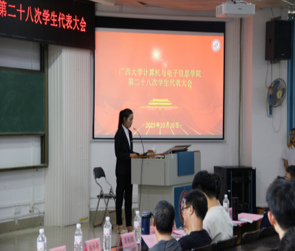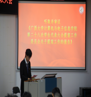 会议第二项议程:学院第二十八届学生会主席团成员罗宇君同学作《广西大学头号玩家官网登录入口第二十八次学生代表大会提案工作委员会关于提案工作的报告》。报告指出,学院学生会采取线上问卷和线下调查的方式征集了同学们的提案,并汇报同学们关于学习、生活等方面的意见建议。